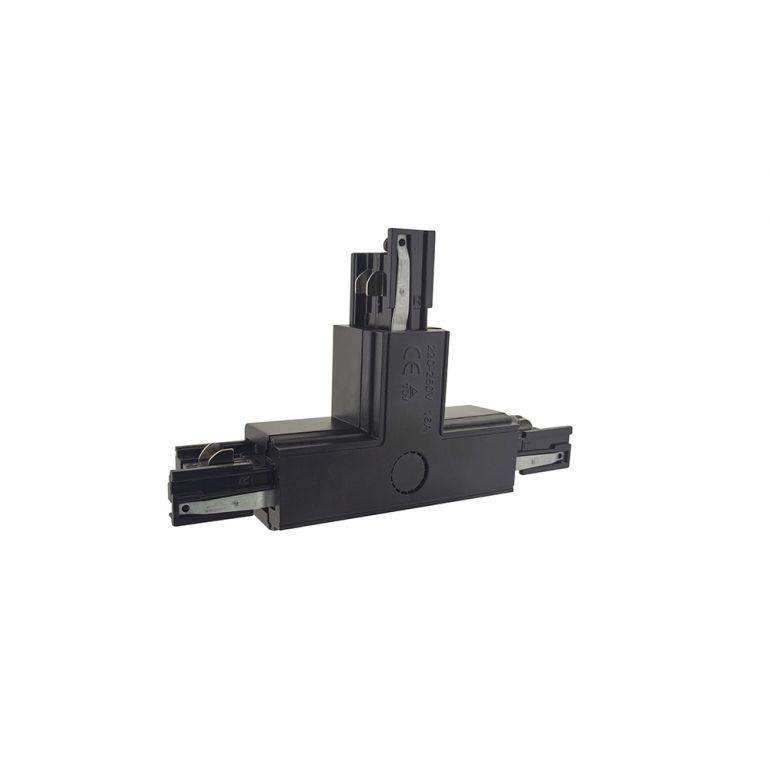 Black connector for T-shaped connection of 3-phase busway WSO-Q. External grounding contact arrangement. R-central. Can be reassembled in any grounding contact arrangement.