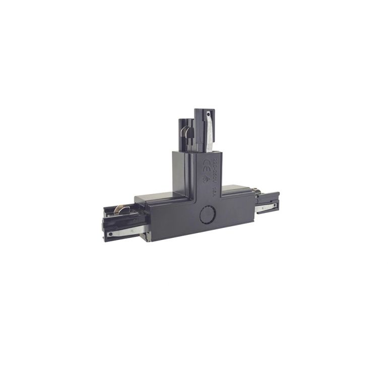 Black connector for T-shaped connection of 3-phase busway WSO-Q. External grounding contact arrangement. L-central. Can be reassembled in any grounding contact arrangement.