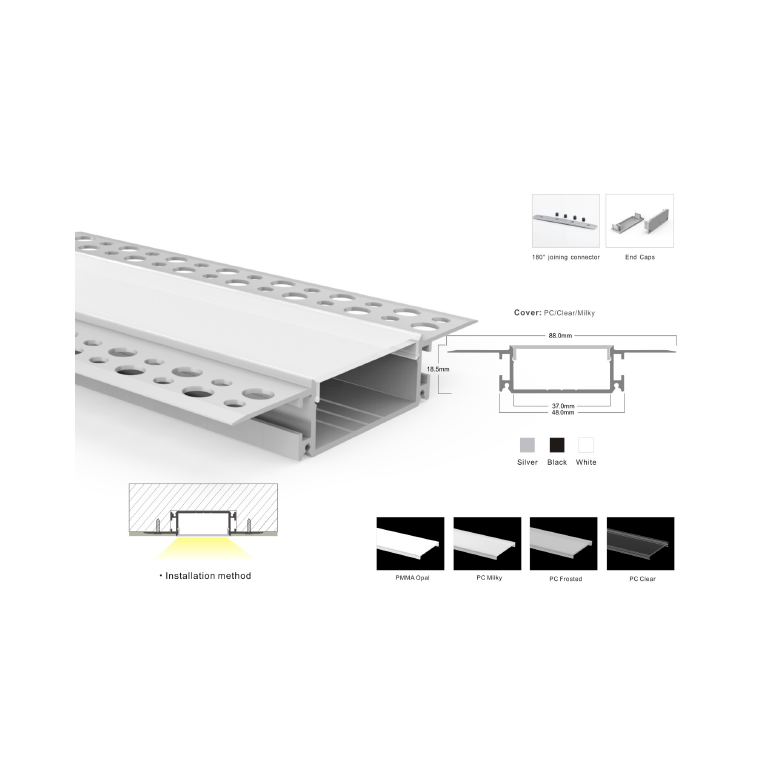 The profile for LED strip LP - SPL083 is mounted in drywall constructions or plaster grooves. This profile is well-suited for installation in drywall ceilings, as it provides not only ceiling illumination but can also serve as a ceiling cornice.