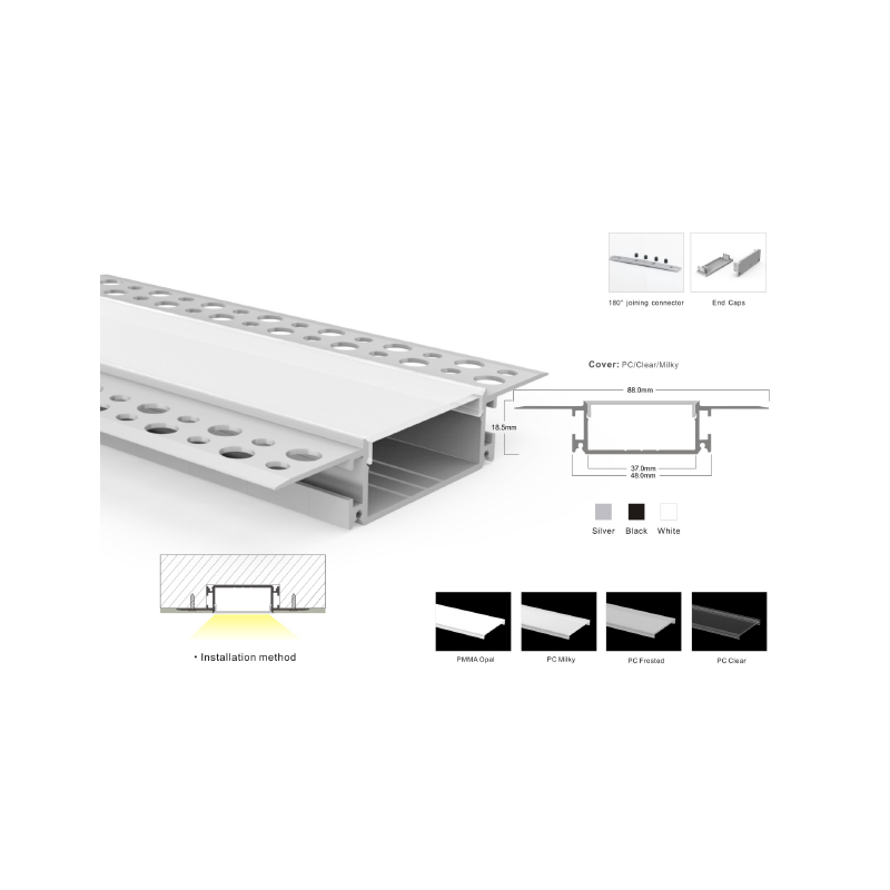 The recessed profile for LED strip LP - SPL083 has the appearance of a box with protrusions on the sides. It is designed for flush mounting in a groove. The profile for LED strip LP - SPL083 is installed in drywall constructions or plaster grooves.