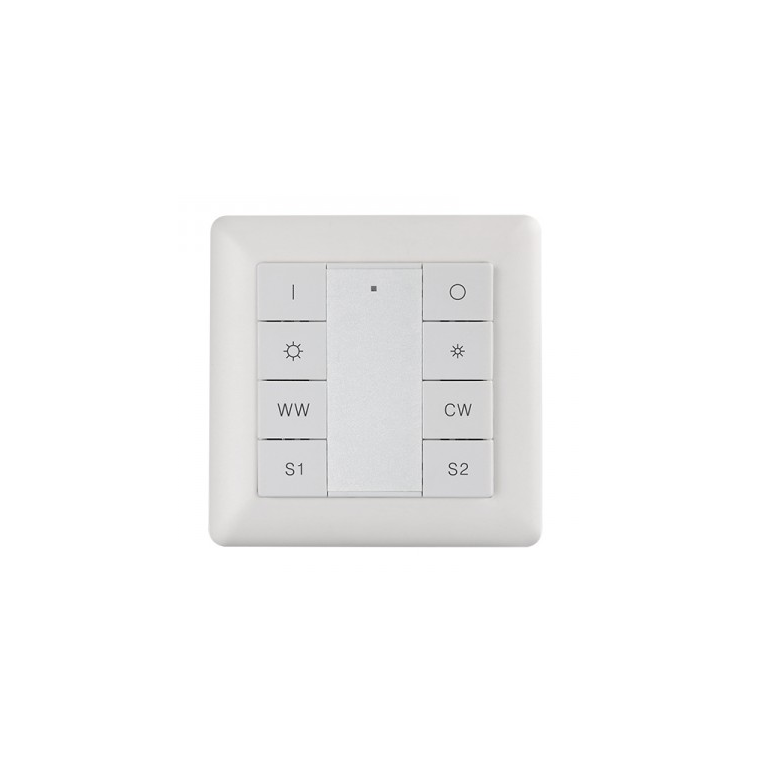 White plastic button panel for operation with DALI protocol. On/off, dimming, and color temperature control for CCT LED strips. 1 control zone. Full functionality with DALI DT8: up to 64 devices on the bus, with addressing 2 channels (CW/WW) to 1 address. Recall and save 2 scenes. Powered via DALI bus. Size 71.2*71.2*13.6 mm.