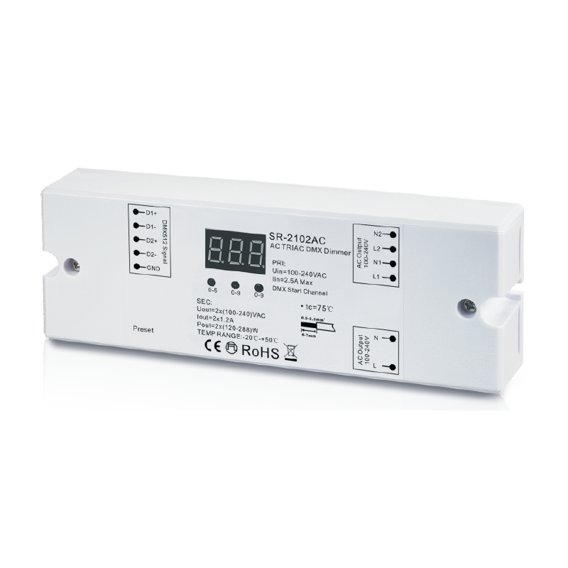 SR-2102AC is a decoder that converts DMX signal into TRIAC control signal for dimming LED lamps, incandescent lamps, or halogen lamps. It is a two-channel dimmer, with each channel rated for 288W for incandescent and halogen lamps, as well as dimmable LED lamps. It is compatible with all DMX master devices from all manufacturers worldwide.
