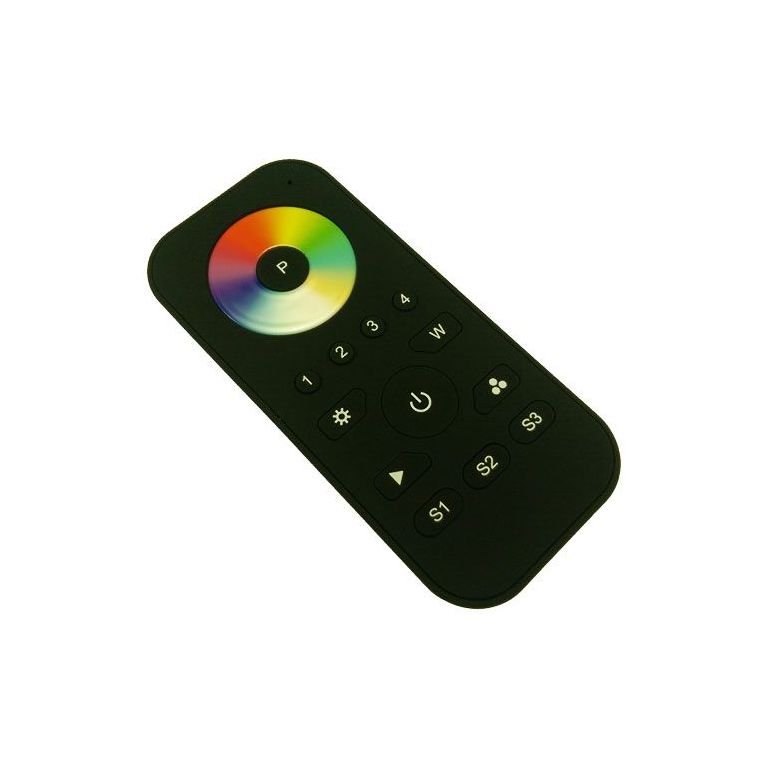 Remote SR-2819SP /4 zones, black casing/ - multi-zone RF remote (868MHz) with a touch ring (TR) for color selection, 4 control zones, programmable modes, high quality from the manufacturer SUNRICHER. Remote holder included.