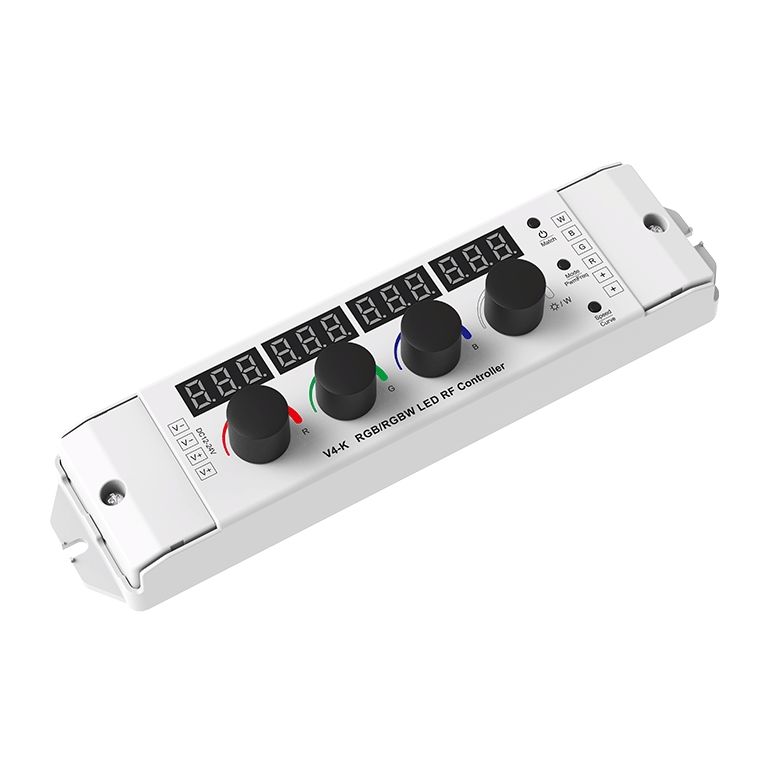 Four-channel controller-receiver with manual level adjustment for each channel displayed on a digital screen, and remote control via RF remote. 4-channel RGB/RGBW LED RF controller. Level indication on digital displays. Control from 2.4G RF remotes for one or multiple zones. Output voltage 12-24V DC. Output current 4x4A. 10 dynamic scenarios.