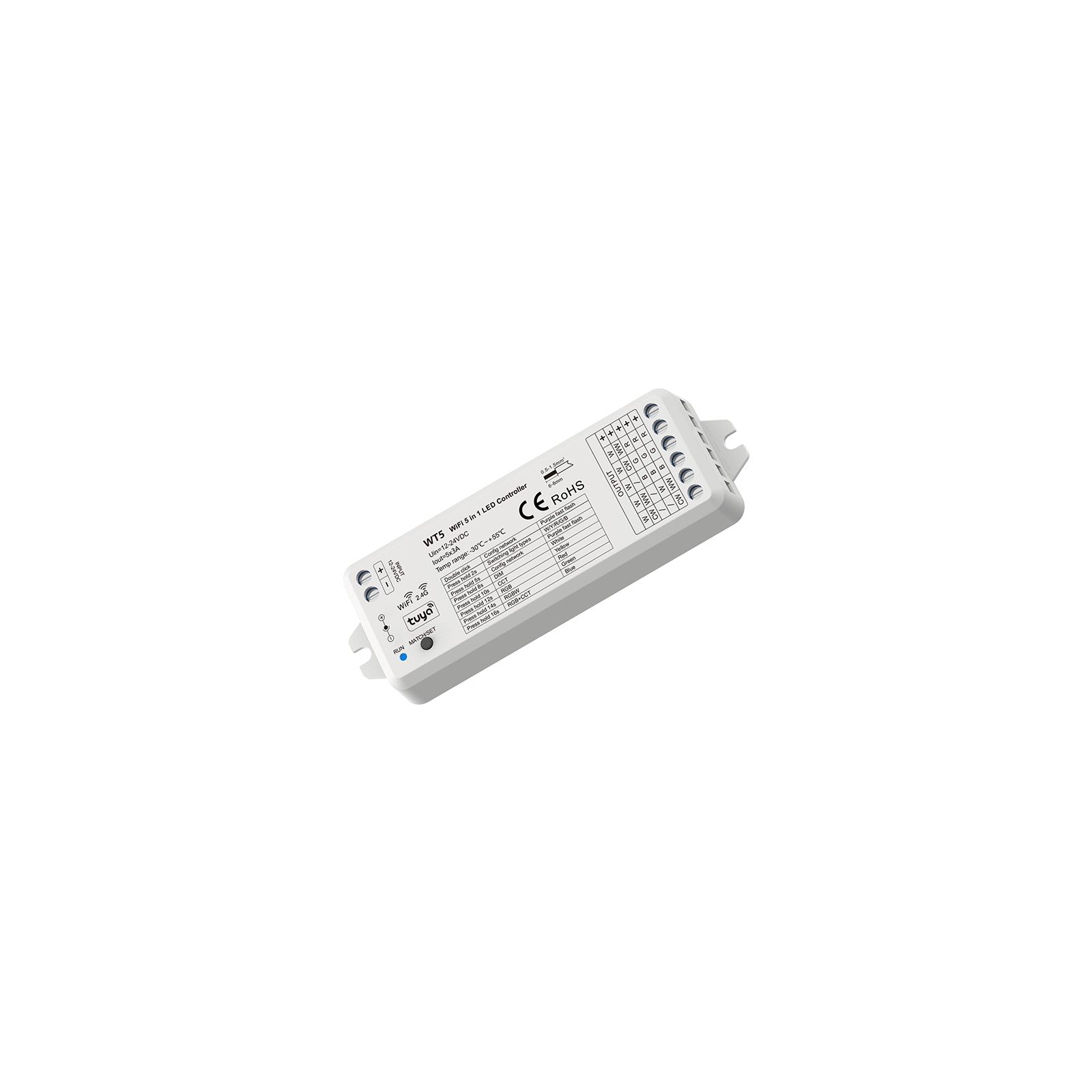 5-channel RF controller for controlling RGB+CCT LED strip. Control via compatible remote or mobile device WiFi. Five output channels with a load of 3A per channel at a voltage of 12-24 VDC.