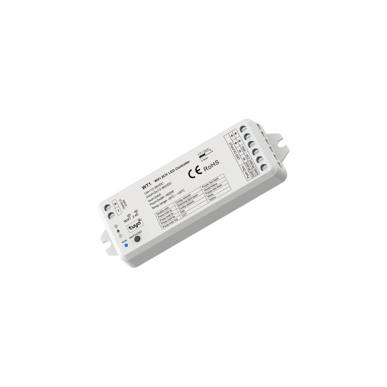 • Two-channel dimmer for white strips with adjustable color temperature and remote control via a remote or the TUYA mobile app through a WiFi router.