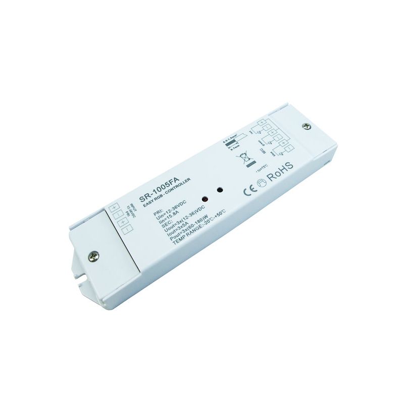 SR-1005FA is a controller designed for changing the color and brightness of RGB strips. It is a three-channel controller, with each channel rated for 5A. The input voltage can range from 12 to 36V. It is used simultaneously with the SR-2809 remote for 2 zones (4149). The maximum power of the connected strip is 180W at 12V and 360W at 24V. The warranty period is 3 years.