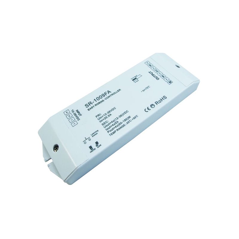 SR-1009FA is a universal controller designed for changing the color and brightness of RGBW strips, adjusting the brightness of monochrome strips, and tuning the color and brightness of dual-color CCT strips, depending on the connected device. It is a four-channel dimmer rated at 20A (4 channels of 5A each) for connecting LED strips from 12V to 36V. The warranty period is 5 years.