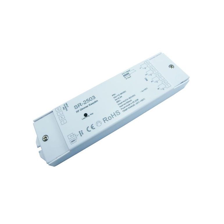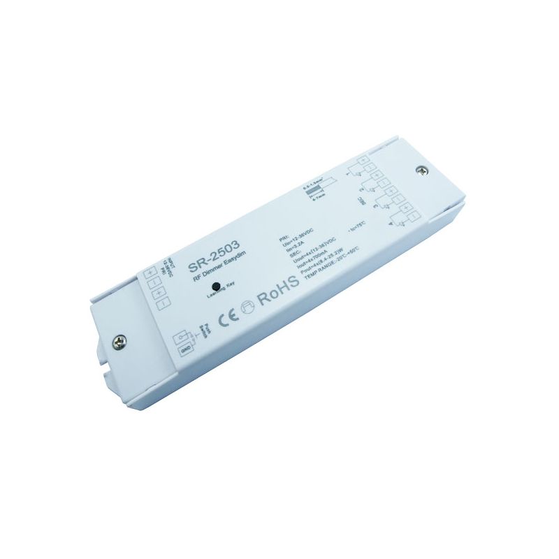 4-channel DC controller 0.7A per channel for controlling LED lights using the wireless remote SP-2828. Not suitable for LED strips. Brightness is adjustable via the SP-2828 remote for one zone. 4 output channels DC 0.7A/channel. All 4 channels are dimmed synchronously. Power supply 12-36V. One receiver can be controlled by a maximum of 8 remotes.