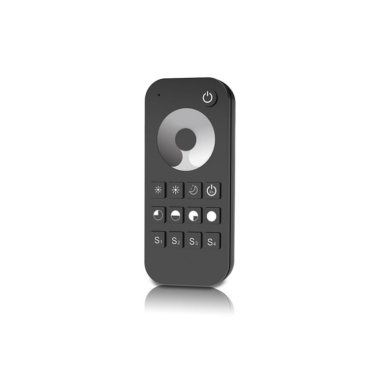 The RT1 remote control is a single-zone RF remote for controlling dimmable monochrome LED strips. Powered by 2x AAA (3VDC). Single-zone RF controller. The remote has a range of up to 30m. It can work with one or multiple receivers. Convenient touch ring for brightness adjustment. Memory storage for four scenarios. Remembers the last brightness level.