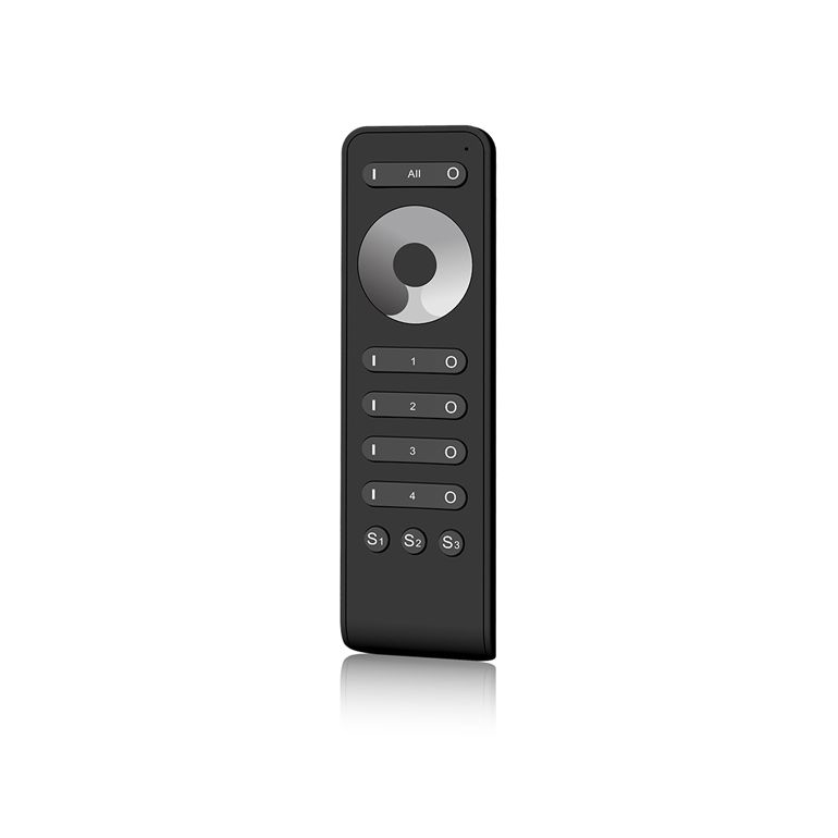 Four-zone remote control for V1-K, V1-C series receivers (dimmers) for single-color LEDs. Four-zone RF remote controller for single-color LEDs. Remote control range up to 30m. The remote can work with one or multiple receivers. Sensitive touch ring for dimming. Memory recording for three scenarios. Convenient magnetic holder.