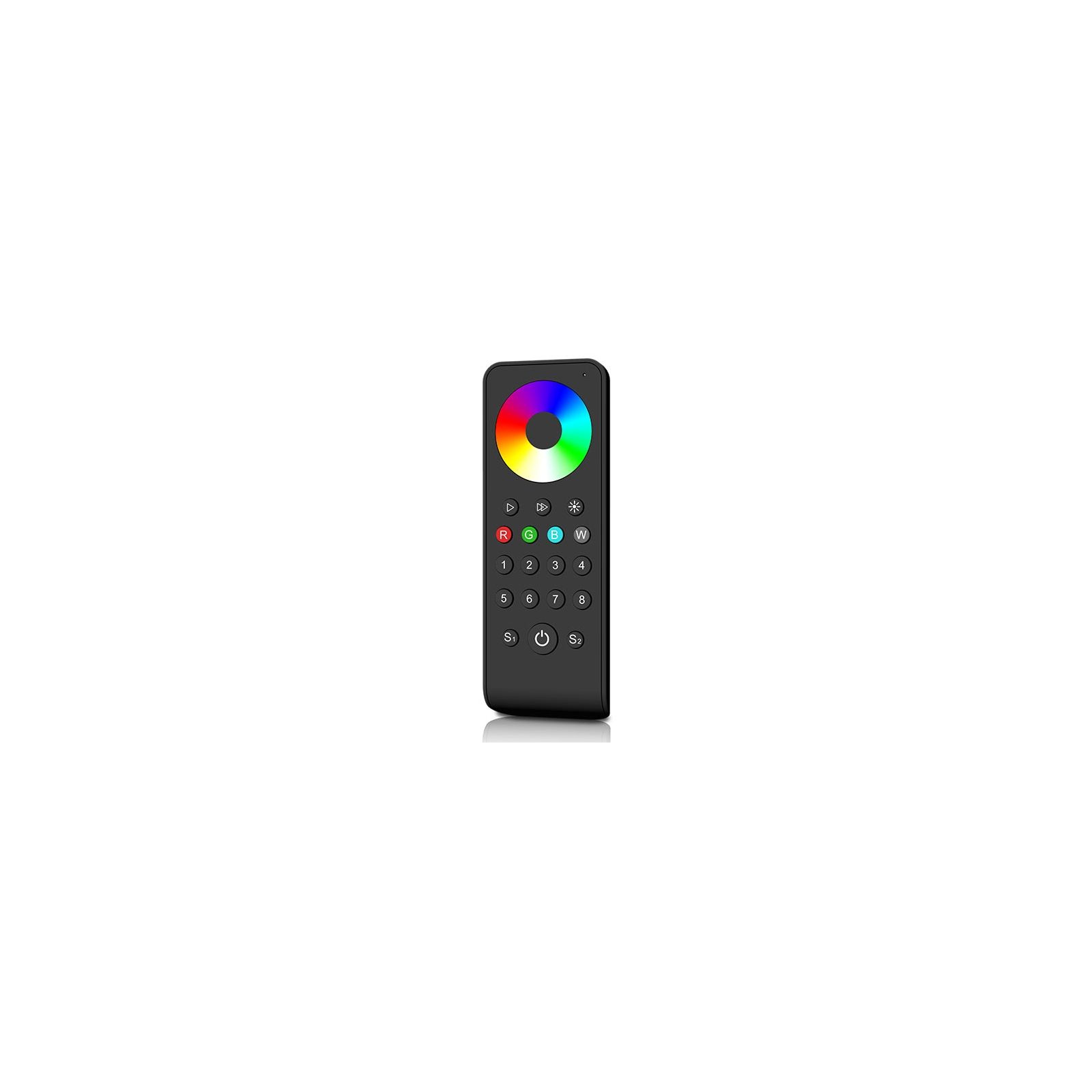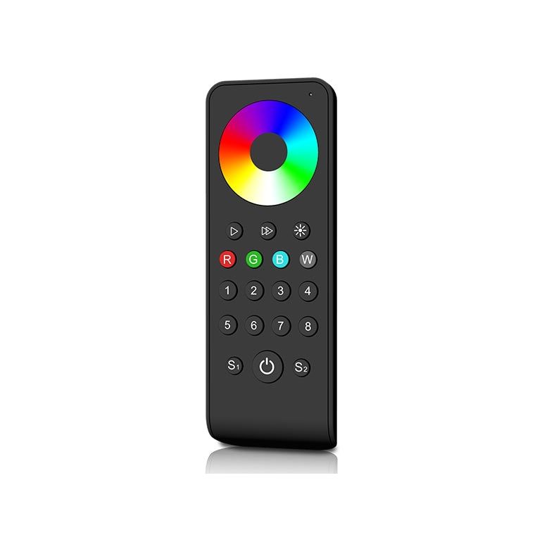 Eight-zone RF remote control for V4 series receivers for RGB/RGBW strips. The remote is suitable for RGB/RGBW receiver controllers. Eight control zones. Sensitive touch color selection ring. Dynamic and static color scenarios. Memory storage for two user scenarios. Remote range of 30m. Magnetic holder.