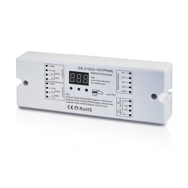 SR-2102 (0–10 V/PWM) - is a LED converter that receives and converts the DMX512 signal into a 0-10 V/PWM signal for switching and dimming single-color LED lighting.