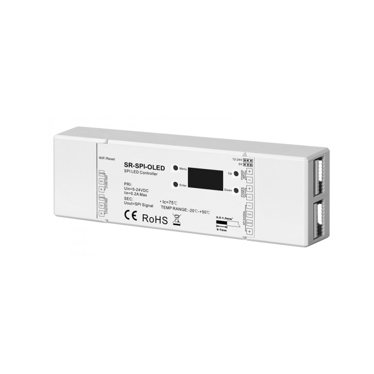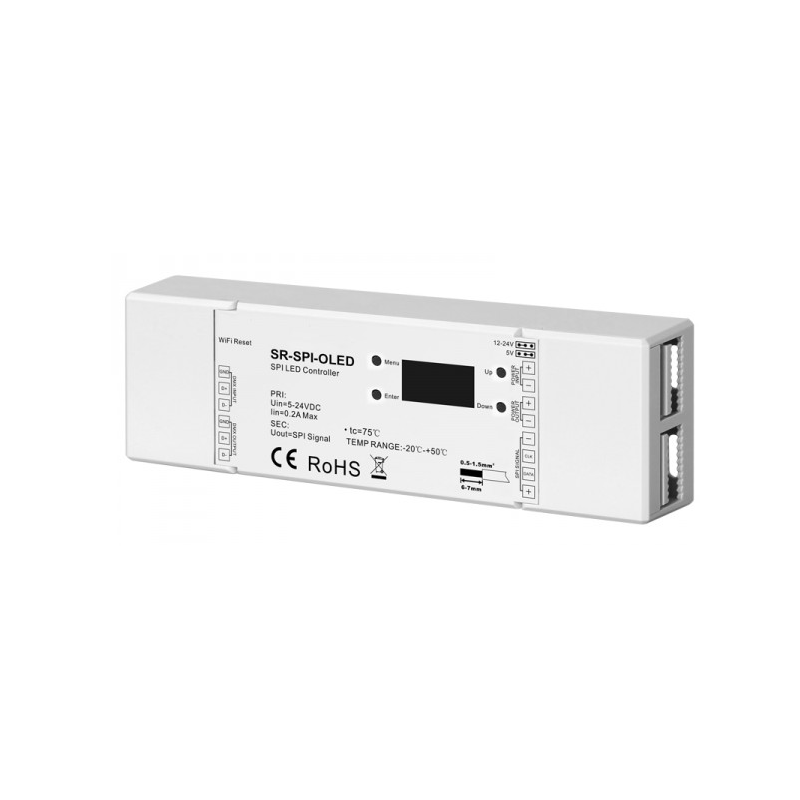 Designed to convert DMX signal into a control signal for digital SPI RGB/RGBW LED strips. Allows decoding of 512 DMX channels, addressing, and controlling 1020 pixels.