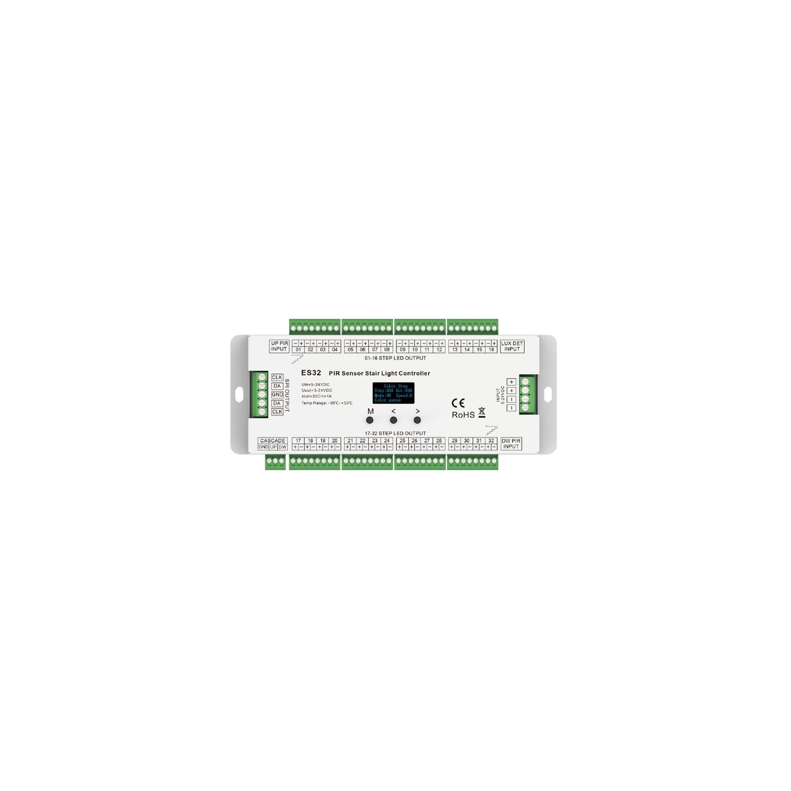 Stair lighting controller. Power supply DC 5-24V, 32 output PWM channels for single-color strips, load current 32x1A. Two groups of digital SPI (TTL) outputs for RGB SPI strips, a total of 2x960 pixels. Supports control for up to 32 steps. OLED display and control buttons on the housing. Sensor activation distance up to 3m. Angle 120 degrees. Dimensions 186x86x25.5 mm.
