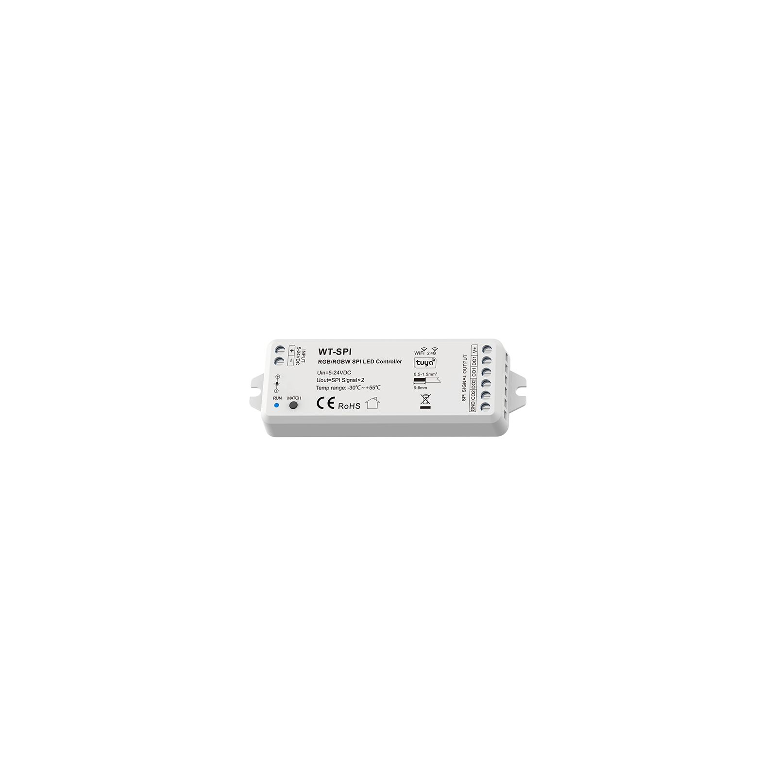 The WT-SPI LED controller-receiver is a full-featured SPI controller for addressable RGB/RGBW LED strips. It is programmable and controllable via the TUYA mobile app from mobile devices based on ANDROID and IOS, as well as through a 2.4G RF RGB remote control. It has a large set of standard programs and can also create its own custom scenarios. Power supply is 5-24V.