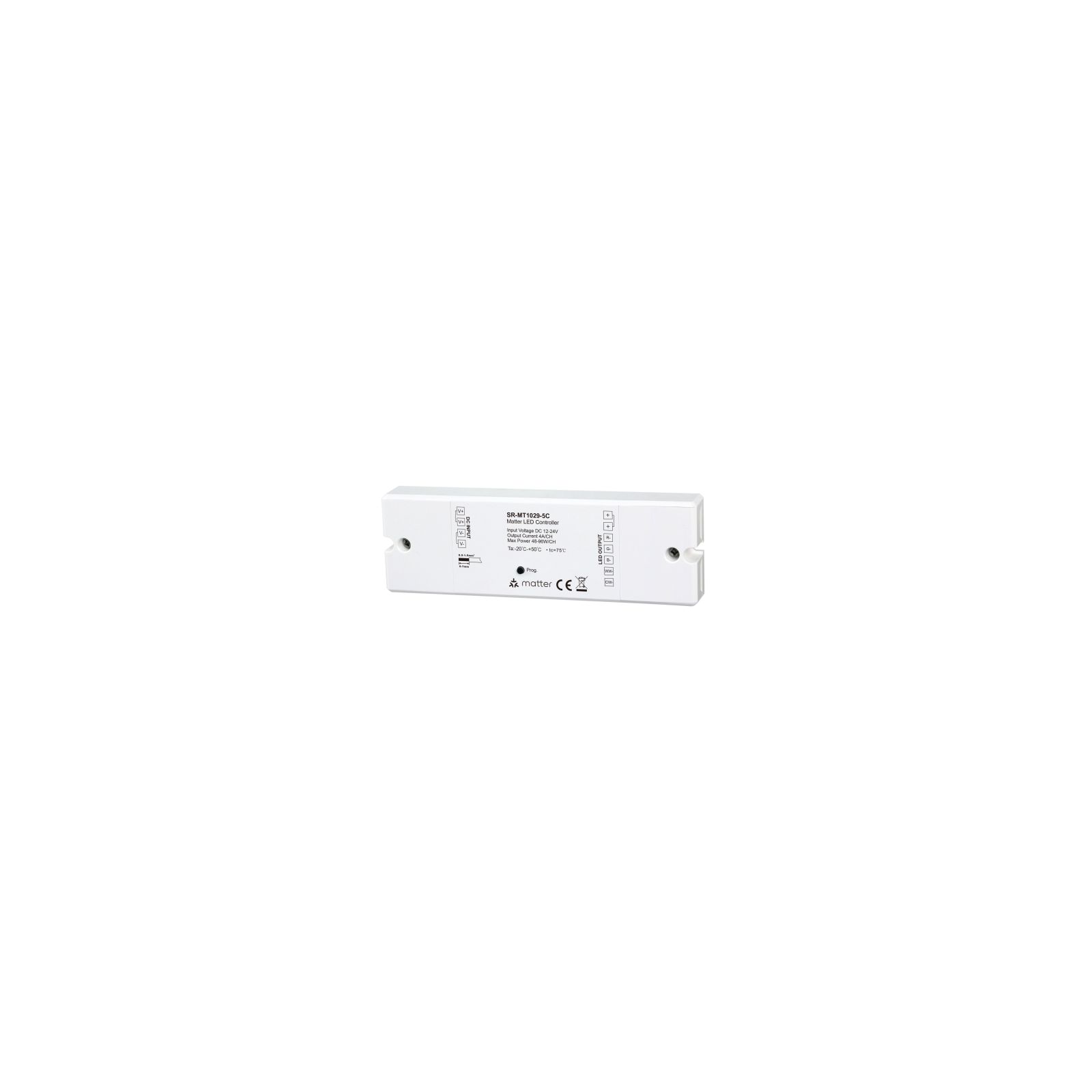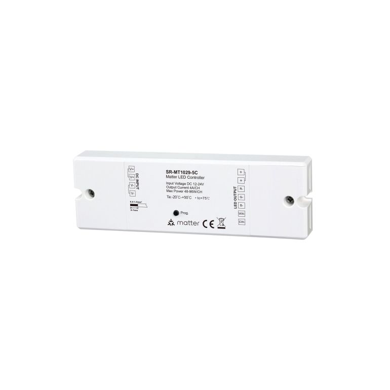 Universal five-channel ZigBee controller for controlling RGB LED lights and adjustable color temperature (CCT) lighting. Compatible with Matter ecosystems from various manufacturers, supports control via mobile apps like Apple Home, Google Home, and others.